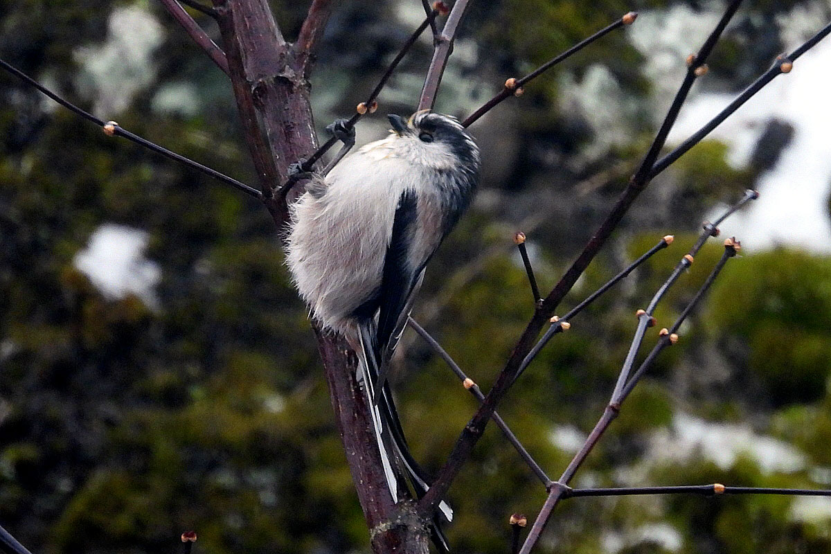週半ば、湿気の多い雪。先週に続いてやってきたエナガ混群。