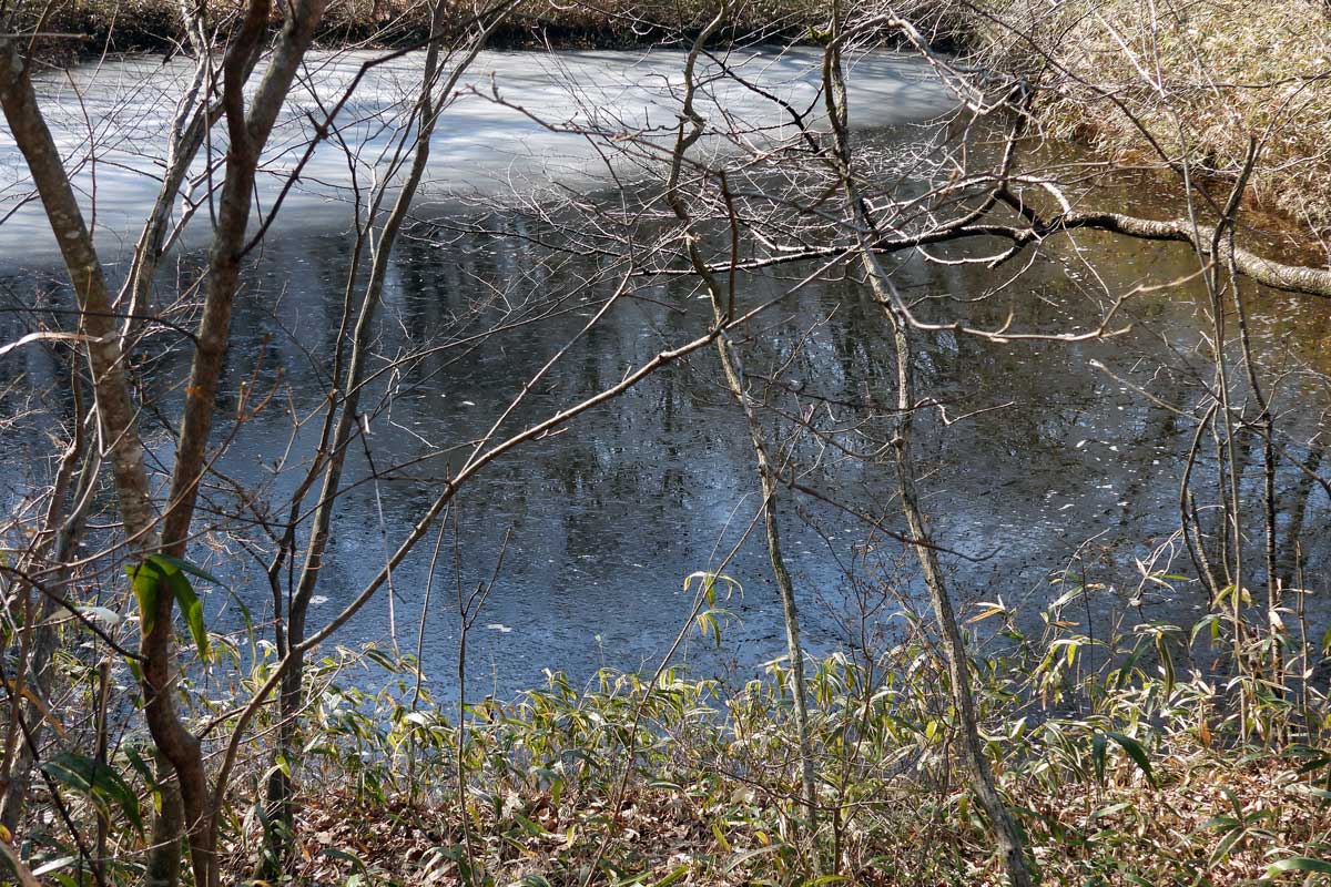 この間まで氷で覆われた溜池は大分融けた。ログ前の土手には水仙の芽