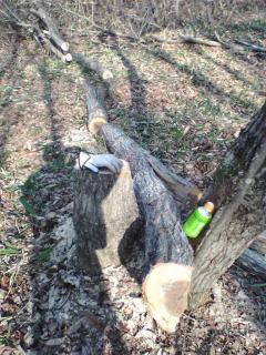はっきりした雨天以外は「笹竹刈り」に精を出した週だった。始めの目論見ではもう木を切っている 頃合なのだけれどなのだが手強い笹竹との格闘にまだまだ時間が掛かりそう。 週末には又天気が荒れそうなので取っかかりにまず1本は伐採したくて径30cm程の栗の木を伐り倒した。 居酒屋「旬」のマスターから教えられた、チェーンソーの扱いと木の倒れ方を思い出しながら歯をあてる。 松は頭が重いので、よく枝ぶりを見て倒す方向を定めないと倒れながら回転する!。栗は裂ける!曲がりながら裂けるものだから 裂けて弾けた上半分が身体を跳ね、怪我あるいはそれ以上の事故に至ることも少なくないとか。 多分、周りで見ていたら随分腰が引け「へっぴり腰」でチェーンソーを握っていたと思う。 この木から。と決めた栗の木は 案の定、倒れながら「バキバキ」と切り口から2m近く「裂けた」裂けて倒れながらも切り口から離れていない下半分が弓のようにしなり根元につながっている。これは伐採としては失敗だろう。 またまたへっぴり腰を駆使して何とか切り株と幹とを伐り離して切り株に腰掛けた。 | ||||||||