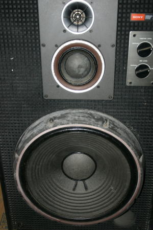 @:::音はOK!体裁部分の化粧直しだけ。 【SS−G7】SONY 形式----------:3ウェイ、バスレフ、フロア型 使用ユニット----:WF38cm/SC10cm/TU3.5cm インピーダンス--:8Ω 再生音域------:30〜20000Hz クロスオーバー--:550Hz/4500Hz 発売年--------:1976年発売 定格/最大入力--:100W/200W 音圧 SPL------:94dB/W/m。 寸法----------:W510xH940xD445 重量----------: 48Kg 価格----------:¥12、8000/1本。 というコイツのSpecは徒然記でメーカーサイトから転記した値だが、とかくスピーカーはそんな数値より実際に目の前に置いて聞いてみてナンボだ。 音は大丈夫ダヨ。と持ち主がいう通り、ポコッと凹んだスコーカーと、何かの先でツツイタようなウーファのコーン紙の穴。それとアルミダイキャストのウーファフレームの白粉噴き。がそれなりの経年を感じさせるが試しに音を出した限りでは音の異常は無い。 普段はサランネットを付けるだろうが、時にその迫力の顔つきを見たいので、多少は化粧直しを・・・ |