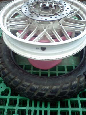 という事でホィールが裸状態になる。 当然ここで汚れなんかを洗い流してキレイにしたいのだが、25歳を過ぎたバイクの塗装はかなりデリケート、単に洗剤で洗っただけでは中々キレイにならないので自分はあきらめた。 |