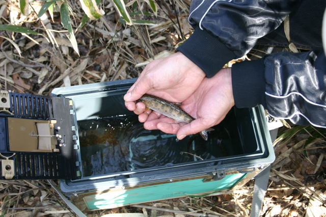 川辺には去年秋に遡って来た鮭の稚魚がいた。 川の水温はまだ低くて大きなヤマメにはまだめぐり合えていない。けれど庵に隣接する池に放つには丁度いいくらいかもしれない。少し濁り加減の湖水にはハヤがいいとも聞くけれど、この若いヤマメはここで大きくなってくれるか? かつては田んぼへの引き水を供給していた溜池も、山間の田んぼを休耕してしばらくなる今は使い道の無くなった池になっている。 ここでヤマメでも育てられないものか!?と。 目的は当然My釣堀ですね! |