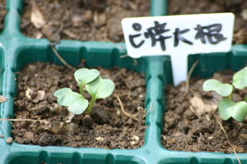 先週の発芽に続いて「チンゲンサイ」「ピリ辛大根」「エンドウ」の芽が出てきた。一応、種袋の裏に書いてある蒔き時期を見ながら時期を見計らい蒔き続けているが、残り「ダダ茶豆」「モロヘイヤ」を残して20種ほど蒔いた。