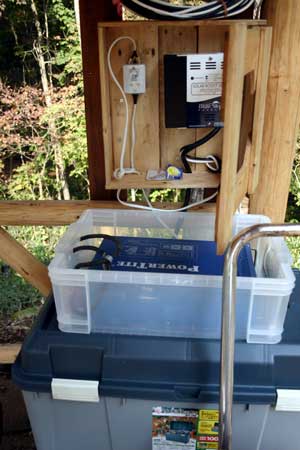 「クリタケ(栗の木モダツ)」はシメジ系と聞いた。見た目は株状に密生し色はヌメリはないもののナメコに似ている。味噌汁によく合うところもナメコ風だが味覚は全く違い、山の落ち葉の味というか・・・。 この日は開墾畑で採れた里芋と一緒に芋の子汁、焼き鳥は皮付き腿肉を串に刺して焚き火で残ったおき火で遠赤焼き。 (手作り焼き鳥はギョウザと並んでスーパー品とかレトルトより手作り!塩山椒が絶対旨い!・・・と信じる) 東屋を電化しよう・・・なんて気はサラサラなくて、ログを刻む為の道具置き場&休憩+αが主たる目的なので真南に向けた屋根が受ける太陽光から電気を頂いて電動工具のエネルギーを賄おうという事なのだ。 パネルは現有と同じND153AUx2枚で300Wクラス。バッテリーは100Ah相当の大型車用を2個。チャージコントローラーは現有MPPT方式の新しいタイプ24V入力で12Vへチャージしている。D/Dコンタイプなので電流増幅出来るところが気に入っている。 屋外使用ではないが壁のない東屋なので、バッテリーとインバーターは道具入れなんかにも使うコンテナにポツポツと通気孔を開けて収納した。 |
