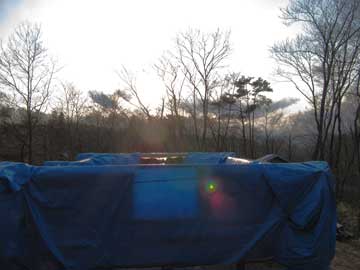彼岸の夕日はブルーシートを外して見たかったところだったが、連休後半は荒れ模様という天気予報にひるみ、まだログは囲ったまま。