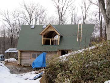 ようやくブルーシートを外せる段階まで来た屋根葺き。屋根の頂点部分やら細部の仕上げはまだ残っているが、雨、雪はしのげるレベルまで来たかな。