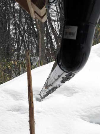 矩勾配屋根のログに雨樋は似合わなさそう・・・ とも思うが、実用性からは雨樋があったほうが安心。気になるのは雪が緩んできた時の落ちる勢いが良すぎることなのですがねぇ。 確かに週明けには「啓蟄」。 それにしても気温が10℃近くまで上がるとたちまち虫が這い出して来る。 陽のあたる場所は雪も大分融けた暖かい日だったが北側にある山道はまだまだ雪は深い。 これからこの融け始めると、雪に強いさすがのジムニー君も苦戦しそうだなぁ。 雨樋は取り付けたが、排水溝までは雪が深くて手付かず。なるべくログ躯体から離して排水したいところ。今は丸樋で3m近く離して流し落とすだけにした。 |