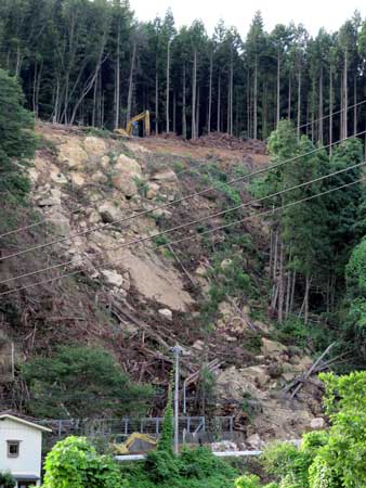 ぽっかり開いたままの玄関口。 これではなにかと無用心、そろそろここにもしっかりしたドアを付けたい所。 こんな感じか!?と用材を並べてみる。アクセントに窓にRをつけようかと。 花弁を散らし始めたヤマユリが多くなってきたが、開墾畑の隅に植えていたカサブランカはようやく咲き始めたところ。 作業場所の脇になにやらイナゴらしきバッタ。なんとなく秋近しの感。 去年の震災で崩れたR457の崖。 ここ2ヶ月ほど崩落箇所の周りを伐採するチェーンソーの音が続いていたが、ようやくその崩れた現場の作業に取り掛かれるようになったようだ。 |