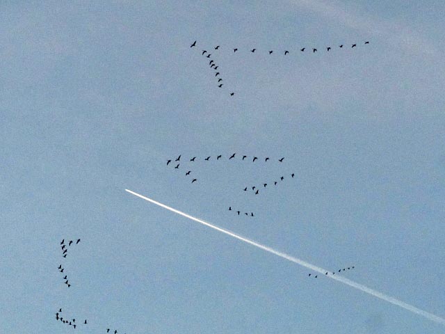 夕方、幾重にも編隊を組んだ鴨の群れ。