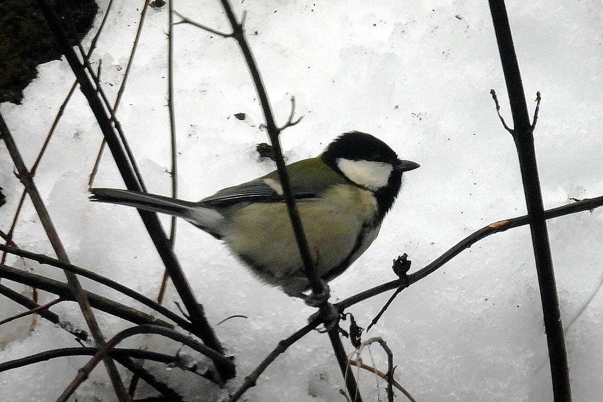 週半ば、湿気の多い雪。先週に続いてやってきたエナガ混群。